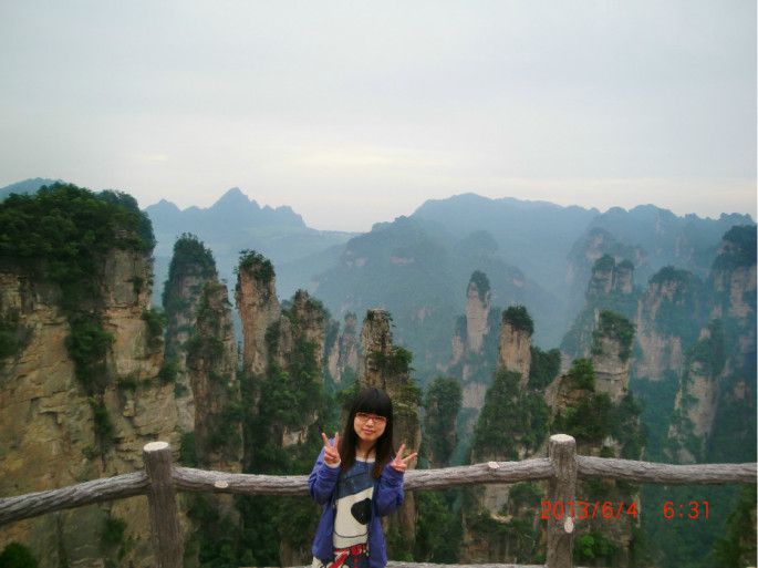 6月4日:早上五点就起床了,包车去老屋场看 日出。包车大概是10人一辆车200元,由于这里的司机师傅是领月工资的,大家是轮流排班制,所以也不存在讲价的问题了,都是一样的。非常遗憾这次没有看 到日出,雾气太大了哦,但是空中田园和神兵聚会确实非常漂亮的风景!还可以看到对面的百龙天梯。八点左右回到客栈,吃过早饭后就步行到了大观台,这也是看 日出的景点。往里面走就到了天子座等四个景点,这一段真的是非常长,走得很累人啊。而且还是原路返回……在大观台路口坐车到乌龙寨,这里有两条线路,一条 是到天波府,一条是到空中走廊。两个都是非常险峻的景点,但是也是非常值得去的,虽然空中花园是个很小很小的地方,但是很美很美,听着风声吹着凉风,感觉很惬意噢!我们几个都非常喜欢这里,还留下了经典照片哈!之后回到乌龙寨门口坐车回到丁香榕。