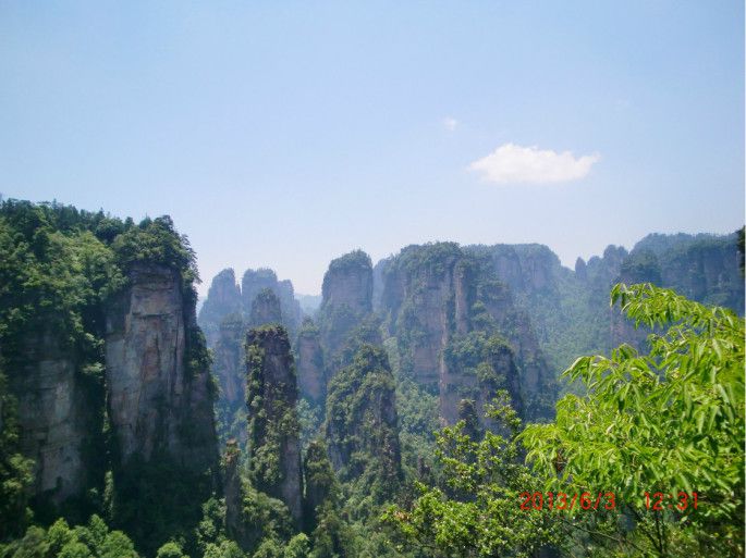 6月3日:早上在导游的带领下在汽车站坐车到了张家界森林公园大门口,张家界景区有好几个大门,根据行程安排我们选择从森林公园大门进去噢!在门口买票,张家界的门票是250元左右,学生证可以打折,但是我们全部人都全军覆没没有买到……售票员一看身份证是88年开头的直接就说不能买,只好买了全票额……所以说张家界的门票真的是不好混过去呀!进了大门往里走就到了氧吧广场,之后沿着金鞭溪一路向前,风景非常漂亮,有山有水。到了十里相会的景点,旁边有个岔道上去就是乱窜坡,这样走的话就可以直接上去到迷魂台,如果不走乱窜坡往前走的话就可以到百龙天梯。乱窜坡真的是乱窜啊,不停的拐着往上爬,还是很累人的,但是爬完之后就是绝美风景了,张家界的标志性景观也映入眼帘,一根根竖立着的石头柱子,O(∩_∩)O哈哈~接着就是后花园、迷魂台、阿凡达的哈利路亚山原型、天生桥、天下第一桥,然后坐车到了神堂湾(张家界景区里面的车是可以送客人到不同的景点,车费包含在门票里面的,早上八点开班,晚上六点收班噢)。神堂湾是个很少人去的景点,但却是非常美,静静临坐是另外一种享受。神堂湾不远的地方就是点将台,两个景点是挨着的,所以可以一起去哈!如果不是小陈的行程安排到位,估计我们都不会到这两个地方的呢。之后在路边等车坐到丁香榕下车,往里面走不一会儿就可以看到很多很多客栈住宿,晚上吃了晚饭,还看到了满天繁星,把我们几个小伙伴激动惨了!