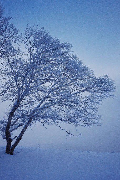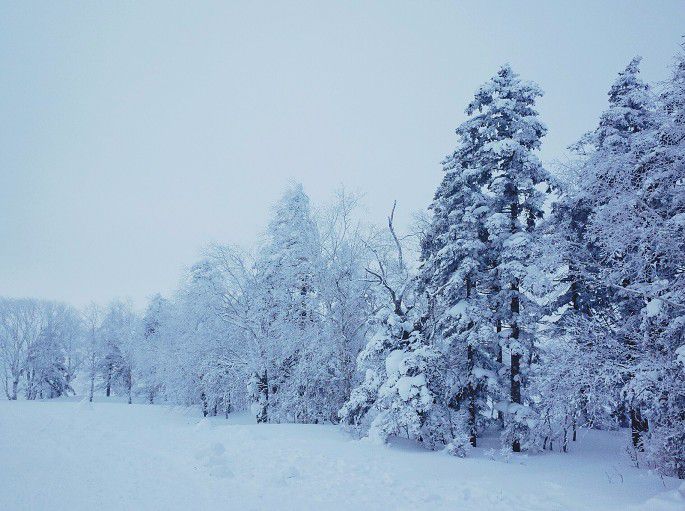 在里面待了一会后,雾气便散了。兴奋地跑出去一顿拍,天空纯澈得不行,大大小小的树上都挂着神奇的冰挂,我踩着深深的积雪走到林间。