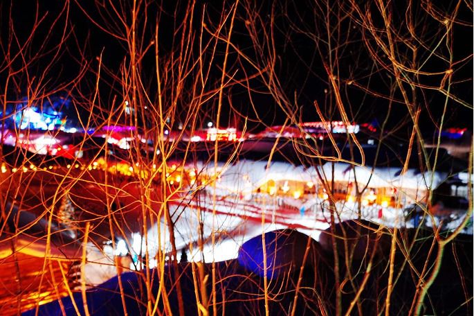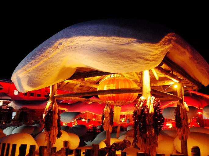 很多宣传图片上的雪蘑菇其实是一个私人景点,叫“梦幻家园”。除了雪乡大景区门票之外,还要再购买梦幻家园的门票,你才能见到心心念念的雪蘑菇。当然是要晚上来看,灯光亮起来之后,这里就是很多人梦想中的童话世界。游客很多,熙熙攘攘,拍照都要抢位置。梦幻家园里的二人转剧场和酒吧,每晚都有东北风情的二人转演出,游客场场爆满。