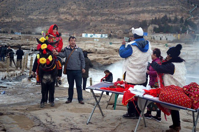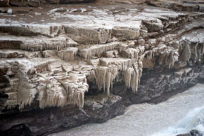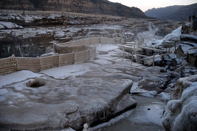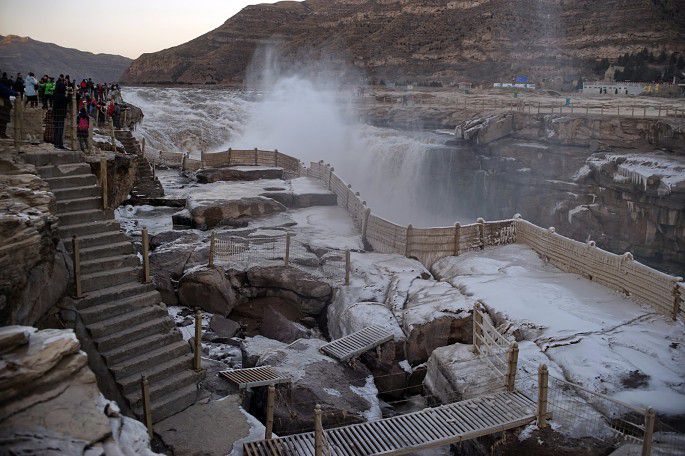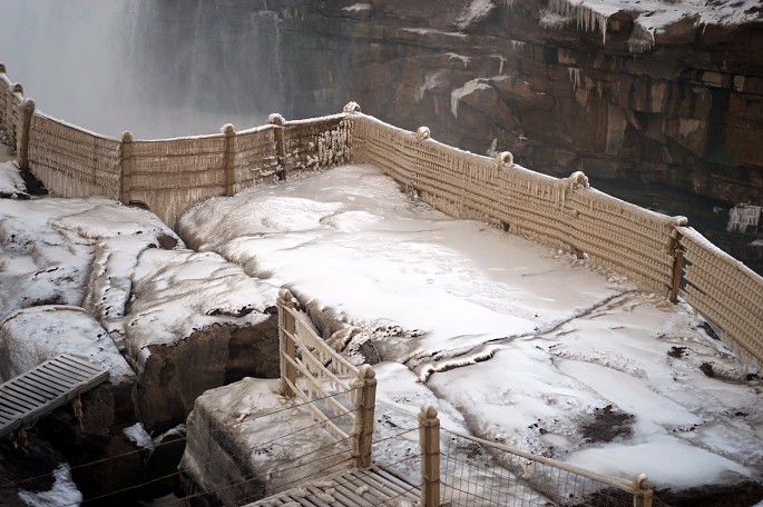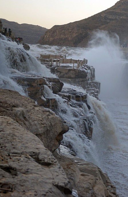 季节不同。12月的壶口已是寒冬,黄河两岸冰刀如丛,利刃高悬;往常游客驻足赏景平台,积雪凝冰,无人敢近;铁网围栏为冰雪包裹,银镶玉砌,恰似仙山琼阁。