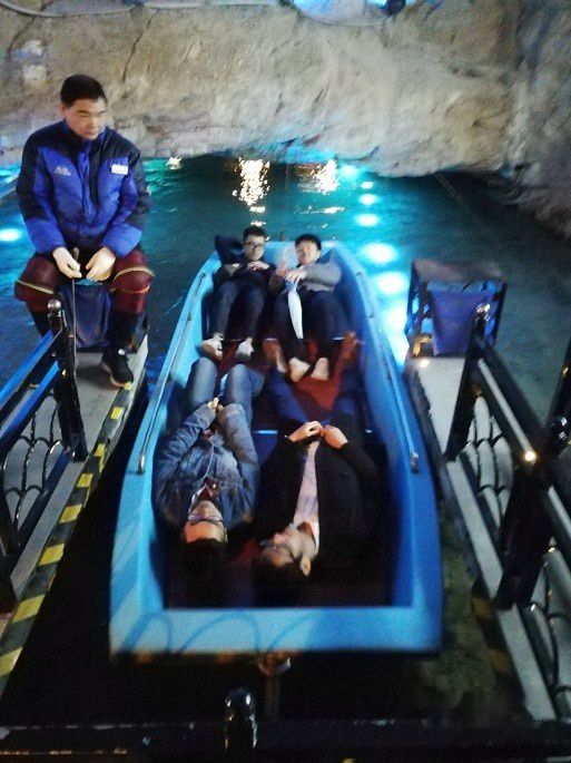 一是,从外洞进入内洞之间,有一块巨大的岩石覆盖在一条清泉之上,距离水面非常的低,船是坐不了的,人必须得直直地躺在船底方能穿过,当穿到岩底中间时眼前一片漆黑,仿佛岩石向身上压了下来,大约10米,又豁然开朗,太有趣了!