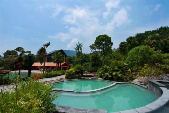温泉、别墅绿树成荫,这里的温泉品质优良,属硫磺医疗矿泉,泉水根据气候变化,能随矿物质的分泌量及四季变化呈现黄、绿、白等多种颜色,号称“西南第一泉”,在业界享有“彩色温泉”之称,是极具特色的山地野趣温泉。