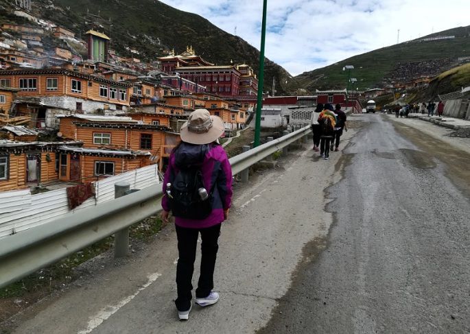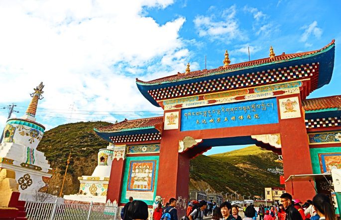 因为国庆长假,来这里的人很多,佛学院那边进行了交通管制,院门几百米之外就不让车辆进入了,只得下车步行进去。进入佛学院是免费的,只需刷身份证就可进入,这里只能中国人自己来,外国人不让进。