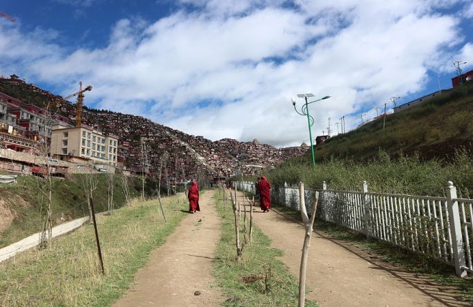 在天葬台看待了一会儿,本来想直接原路下山的,身旁却停着两三辆摩托车问是否要下山或上山,看了看山头,感觉这山头还是有点高,毕竟是高原,在这里所有的动作都得慢,也不知道上面的景怎么,骑摩托车的人就只说上面就是观景台,也没说清具体是什么景,一时拿不定,正犹豫之中,从山头陆续下来几个人,听他们说上面可以更全面的看到整个佛学院,还给我看了他们刚拍的相片,看到相片,坚定要上去。为了节省时间和体力,以20元跟一旁的摩托车主达成交易送我上去到最高点。在高原的山上坐摩托车这也是个挺刺激的一事,关键那骑车的那位大哥的技术还不赖!