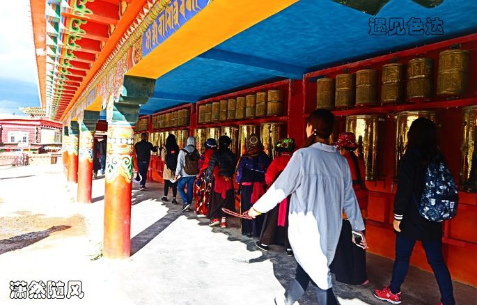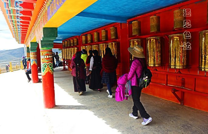 且行且停地走了大约一个小时,终于到达坛城。坛城是佛学位于山顶,是佛学院最高的地方,坛城共为三层,一楼全是转经筒,坛城转经筒所转的圈数是分等级的,一等祈福是10800圈,二等祈福是1080圈,三等祈福是108圏。传言转108圈可以洗净一生罪孽,密密麻麻的经筒承载着人世间密密麻麻的心愿,六字大明咒,一转又一转,一声又一声,跟着前面的人群,不未曾数过我转了多少圈,是否转够108圈。