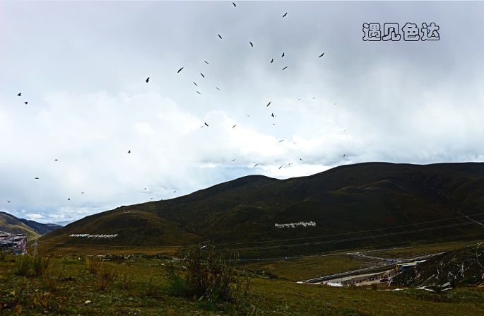 天葬是藏地人一种传统丧葬方式,是指把死者的尸体喂鹫鹰。佛教相信人的灵魂不灭,死后的尸体也只不过是一个皮囊,拿这皮囊喂鹫鹰,是最尊贵的布施,体现了大乘佛教波罗蜜的最高境界—舍身布施。观看天葬在色达来说是合法的,之前去西藏的时候没有看过,此行来色达,看天葬是一早就确定好的。色达天葬台位于佛学院附近的一个半山坡上。根据“遇见”帅哥给的行程规划,从坛城是直接有路走过去的,但问了几个人都说不知道那条路在哪,而且都说要下山另外坐车过去,观看天葬的是时间一般都是中午12点到下午2点之间,看了看时间,已是中午12点半了,恰巧碰到在这里修行的丹佩尼玛也要去那边,他告诉我说要到下面广场中心坐观光车下山到站点再拼车过去。于是便与他同行了,只是坐车的人实在是太多了,我们最后也只能是上了前后不时间的观光车。