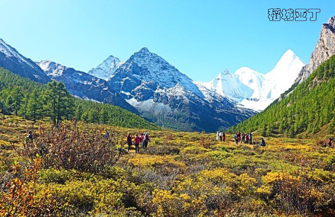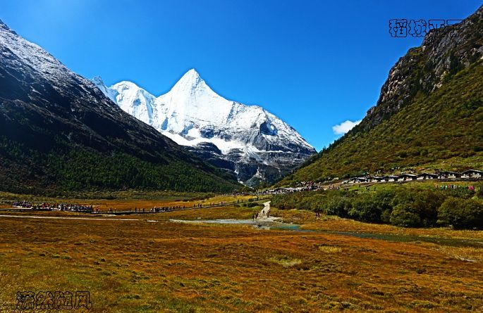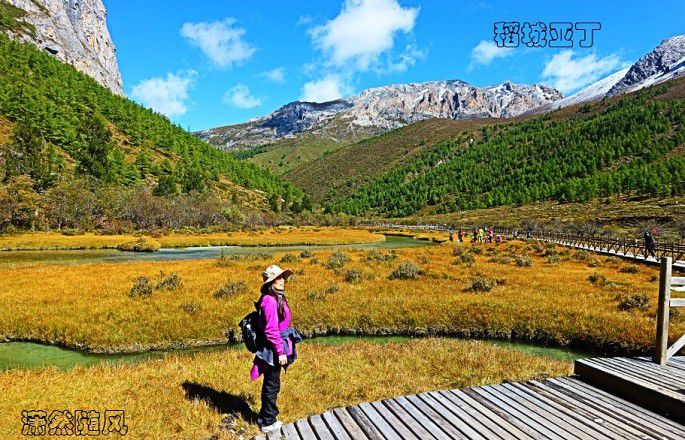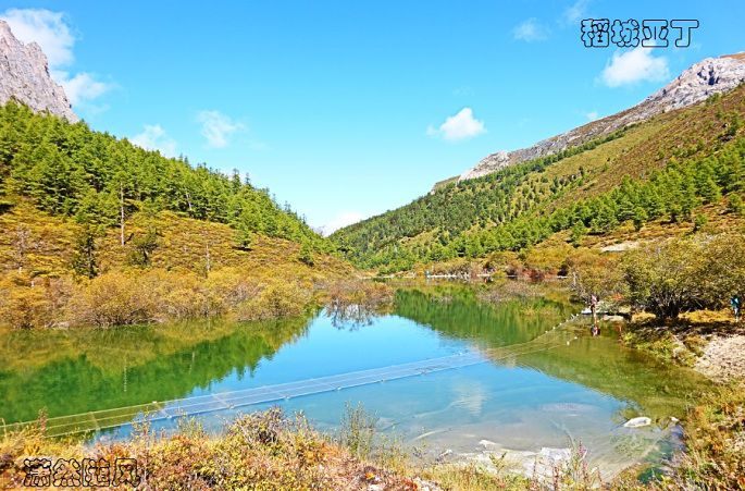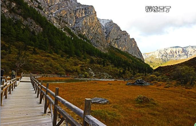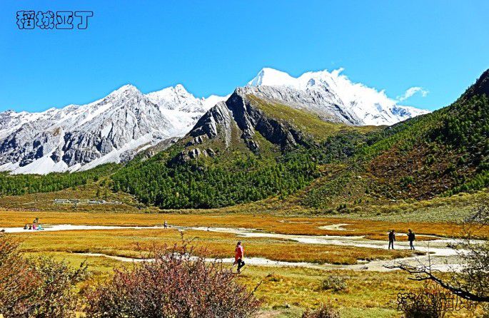 左右分路,右边去冲古寺、珍珠海方向,左边是去洛绒牛场、牛奶海、五色湖和三大神山的方向。我为牛奶海和五色湖而来,于是毫不犹豫向左边走去。根据“遇见”帅哥的建议,我本来是要坐电瓶车来往洛绒牛场的,但看售票处那长长的队伍,最终选择了徒步前往。
