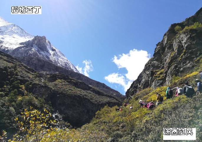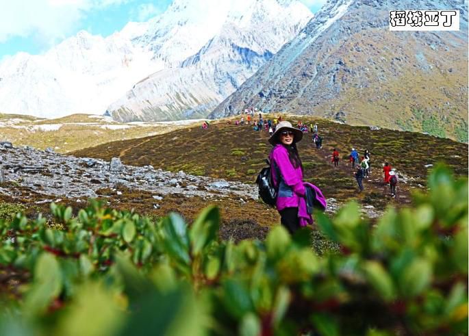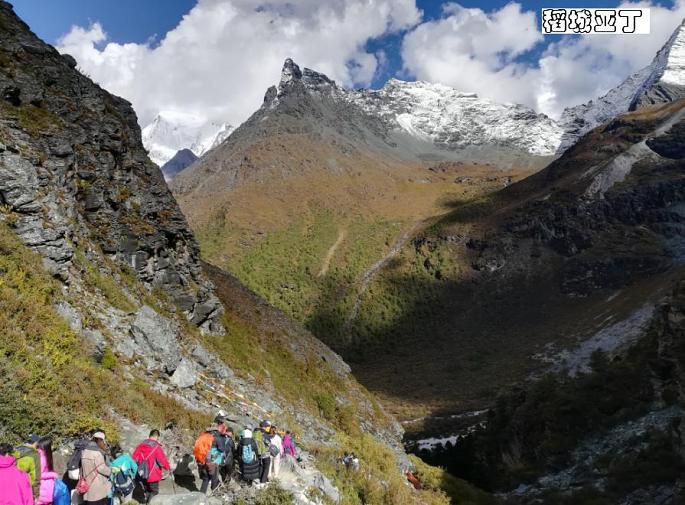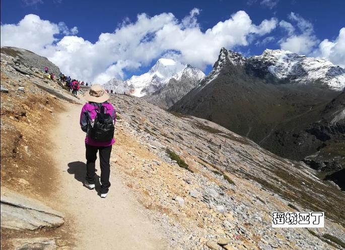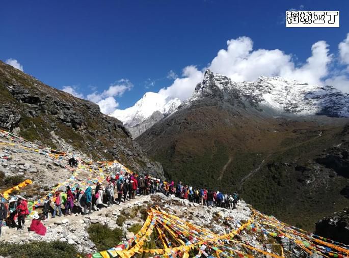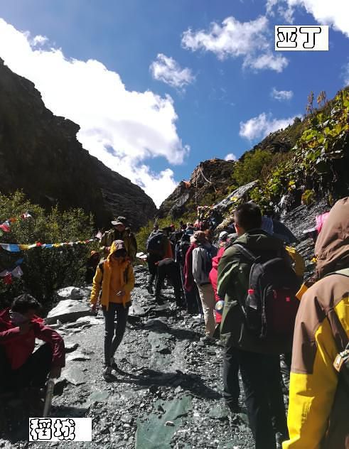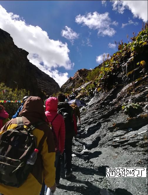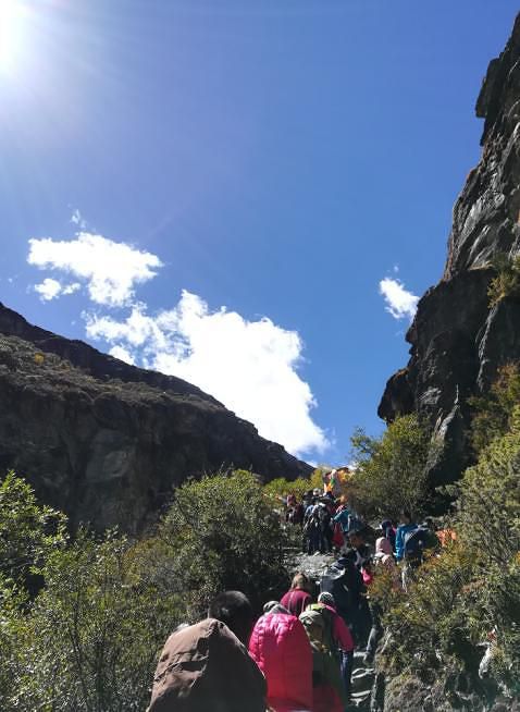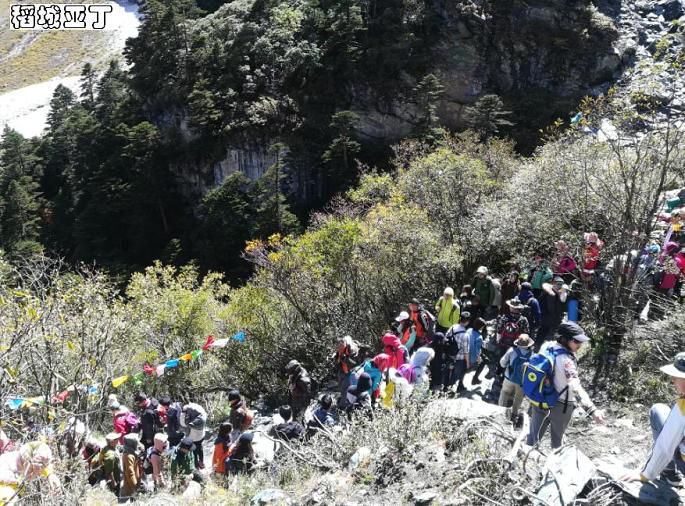 从洛绒牛场海拔4180米向上爬到五色海4600米的高度,虽然仅仅是五百米左右的落差,但别忘了这可是高原,游客也只能是三步一歇地慢慢攀爬,甚至中途也有不少人放弃折返了。前面刚开始的一段路面还挺宽的,路况也不错,都是原始的山路,虽然不好走但也还算轻松,但到后面就渐渐有点吃力了,速度也就慢下来了。走了大概半个小时左右,停下来休息时,听下山或中途折返的游客说,前面堵死了,很多人排队都很艰难通行,上去再下山,可能都得到晚上了。熟悉的我人都知道,在爬山游玩中,我很少有中途放弃的,所以只是呵呵一笑继续往前走。再走了十来分钟,果然,在最险最陡最窄的地方堵住了,下山的下不来,上山的上不去,大家都嚷喊着分排上下山的分左右两队,排队依次慢慢通行,但即使这样,因为今天仍是国庆假期,游客还是很多,进程非常缓慢。上山的有些人等不了了,自己从右边的山坡上再走出另外一条道了,真可谓是“世上本无路,走的人多,就形成了路。”而且在一些比较险陡的地方有景区巡警在那里维持秩序,并伸出一只手拉一把上下山的游客,他把手伸向我那一刻感到非常温暖!