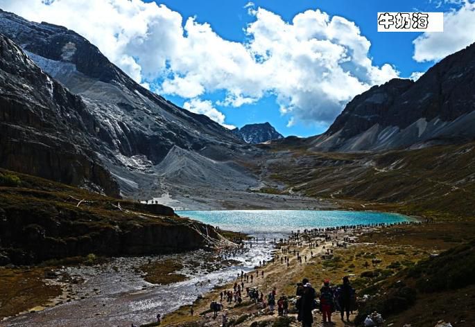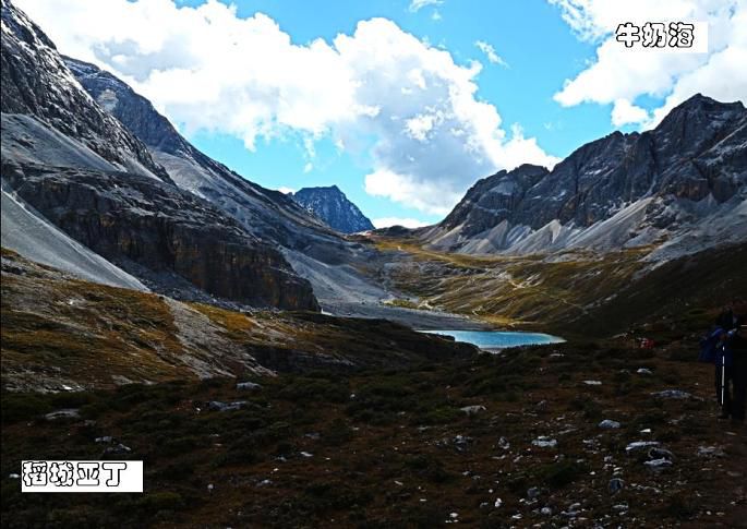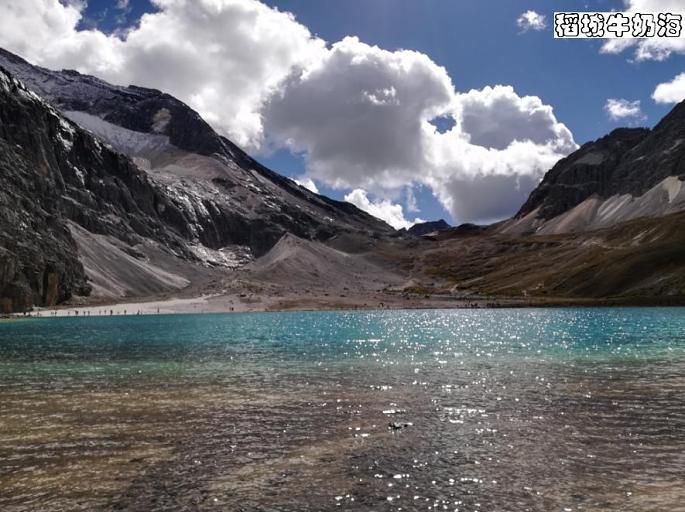 牛奶海位于央迈勇山脚下,是一个古冰川湖。传说,每年春暖花开之时,湖水会像牛奶一样洁白如琼浆,并因此得名。只是,面对于稻城亚丁牛奶海一景时,我发现我很难用一个或几个词汇去准确地描述我当时的感受。牛奶海给我惊艳的地方,是在于她与四周一片荒凉形成了非常强烈的对比,那玲珑秀雅清莹碧蓝的湖泊又是如此的小,这让我想起了2014年去敦煌看到的鸣沙山里的那一汪月牙泉。