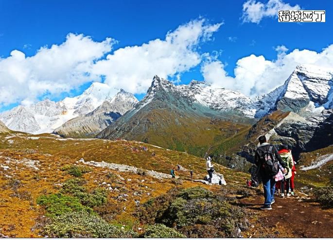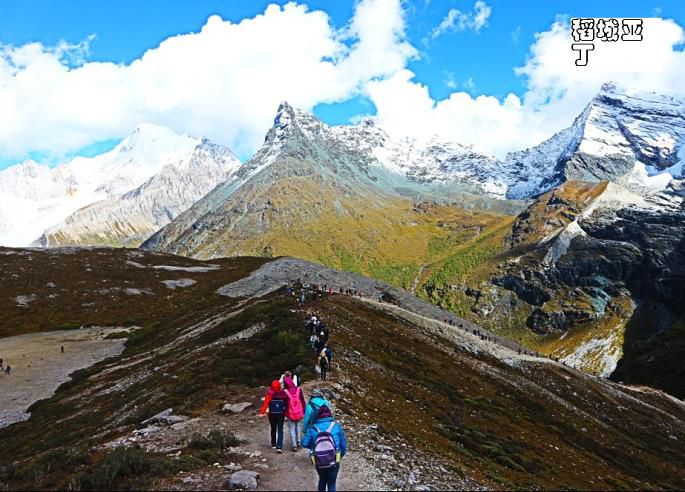 走在山上,右手边,翻过山坡便是五色海,左手边是高昂的央迈勇雪山,前方直走是由雪山环绕着的牛奶海。