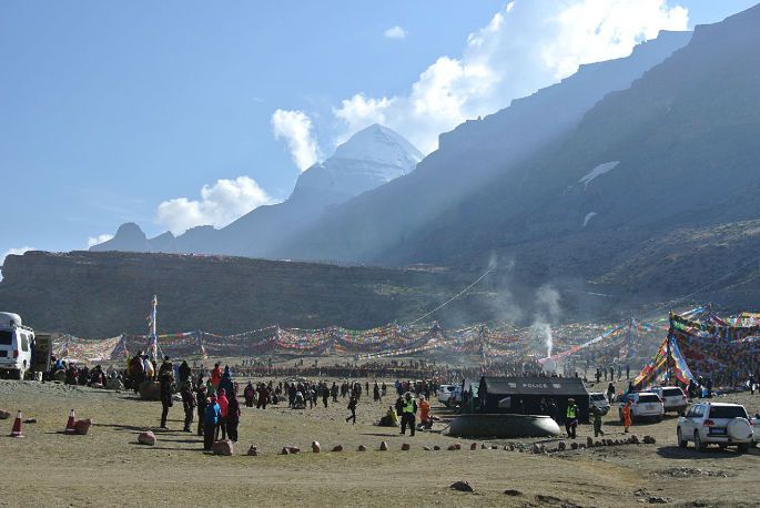 双湖对面的纳木那尼峰一直静候,我们的车子无论在哪里都能看到它。冈仁波齐峰却一直藏在云雾中,直到进入塔尔钦才变得清晰。塔尔钦戒备森严,我们通过了二十几道边检才来到这里,又一次全面检查,我们的炉灶都被滞留在了检查站。因着次日的萨噶达瓦节,塔尔钦居然没有我们一间房。看到J车出现,我作代表冲上去拦车并出示证件,请求帮助。两个同行,一个藏族一个汉族,相当耐心地一家一家帮我们去问,终于让我们落脚在神山圣地青年旅舍。虽然条件非常简陋,可是我们排除万难,不远万里来到这里早就想到了种种艰辛。吃好晚饭,找好背夫,整理次日随身衣物,在这个限时供电、海拔4700的地方先将就一晚,等待次日转山。