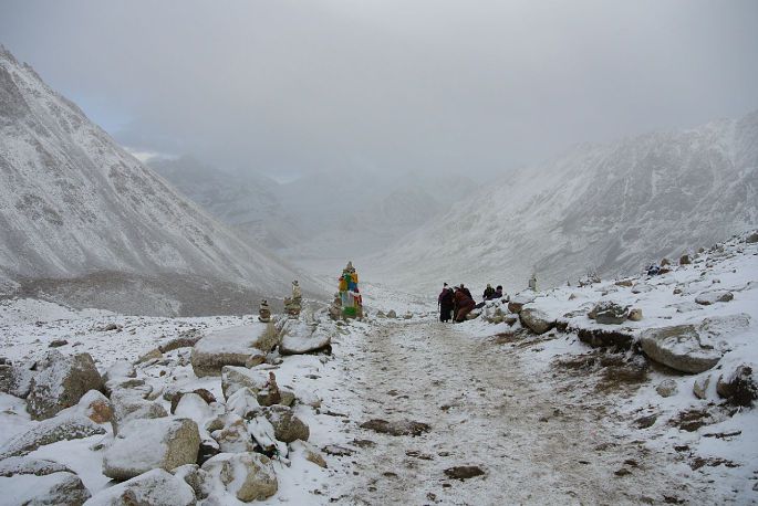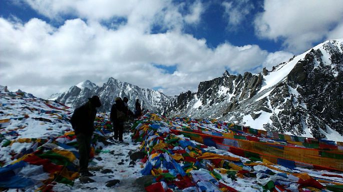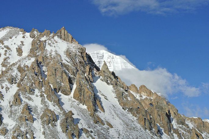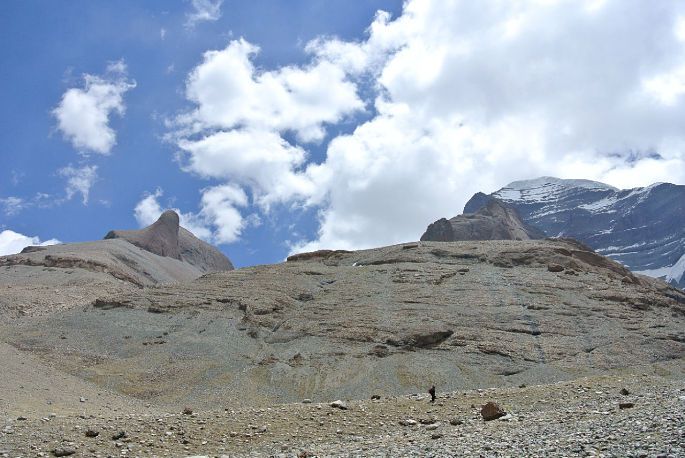 一路调整呼吸,缓慢行走,途中时而看阳光穿透云层照耀雪山,时而见冈仁波齐峰飘过祥云露出峰顶,时而雪山上风云骤变暴雪来临,全程6公里,用时五小时,步经三雪峰,终于苟延残喘登上了海拔5630的卓玛拉山口。两个人兴奋地撒龙达(风马),拍照片,气喘嘘嘘地堆玛尼堆,压衣服。