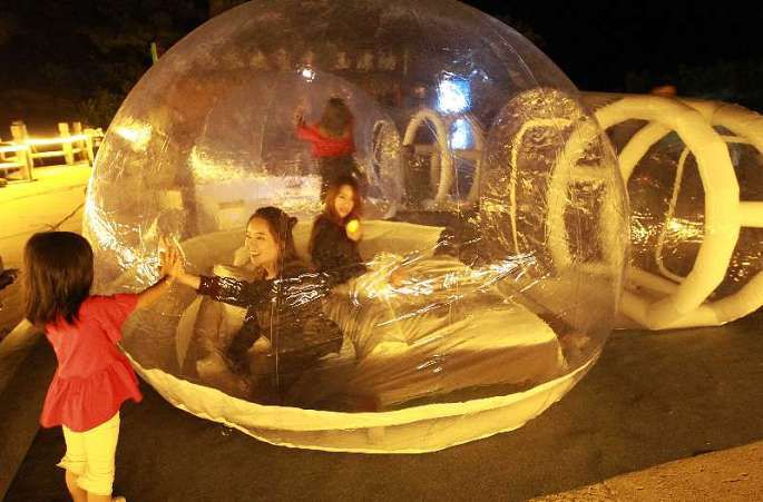 夜深了,我们开始热火朝天的在山顶平台处搭起了帐篷,没过多久一顶顶五颜六色的帐篷就出现在大家眼前,更让我们感觉惊讶的是山上出现了之前只在图片上见过的2顶透明的帐篷,哎呀,赶紧进去体验了一把哈哈。