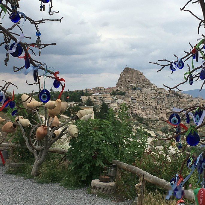 山谷边有两棵枯树,一棵树的枯枝上挂满了蓝眼睛,另一棵挂的是瓦罐。蓝眼睛是土耳其的驱邪之物,在小巷、在街边、在家门前,我们时时能看见蓝眼睛树。