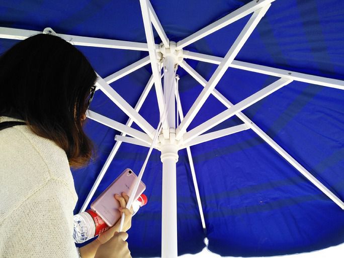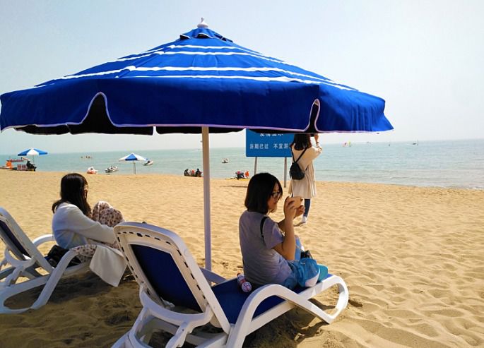来到沙滩上看到有遮阳伞和躺椅,快撑开享受一下!