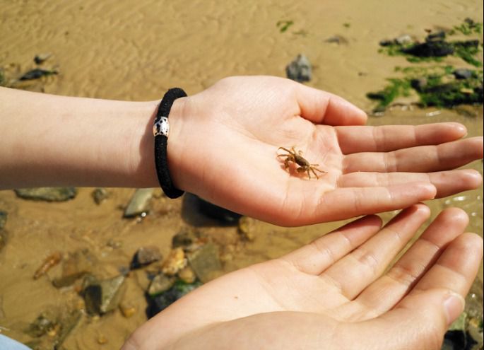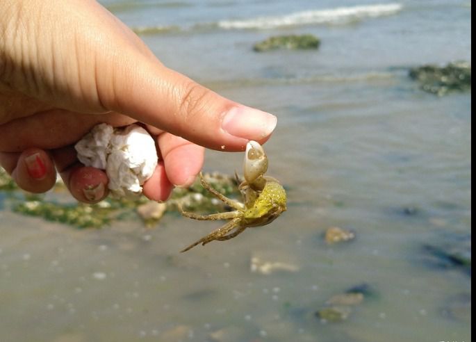 瞧!很快就捉到一只小螃蟹,哈哈,很容易吗!