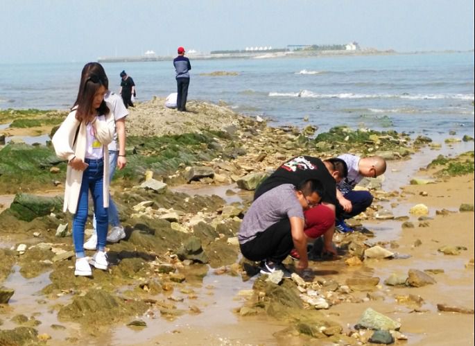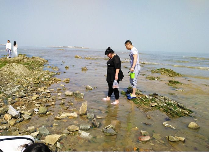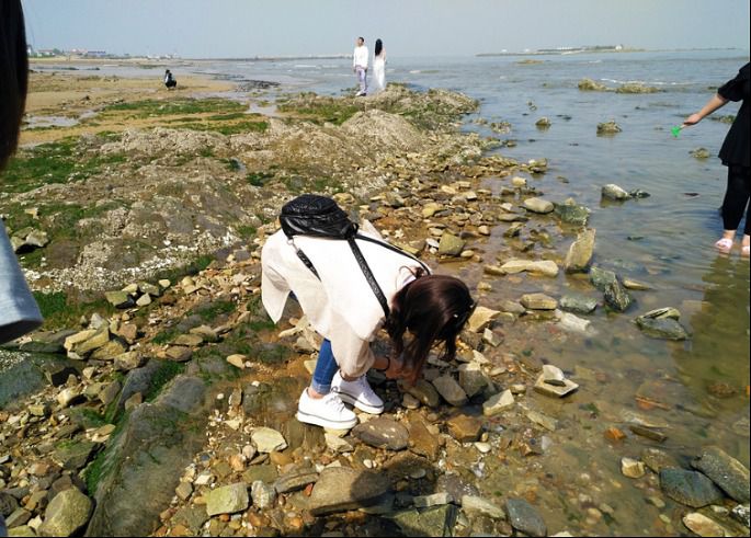 礁石上的每个人,不管男女老少,一律埋头弯腰的认真寻宝,对于如何赶海我们还有些茫然