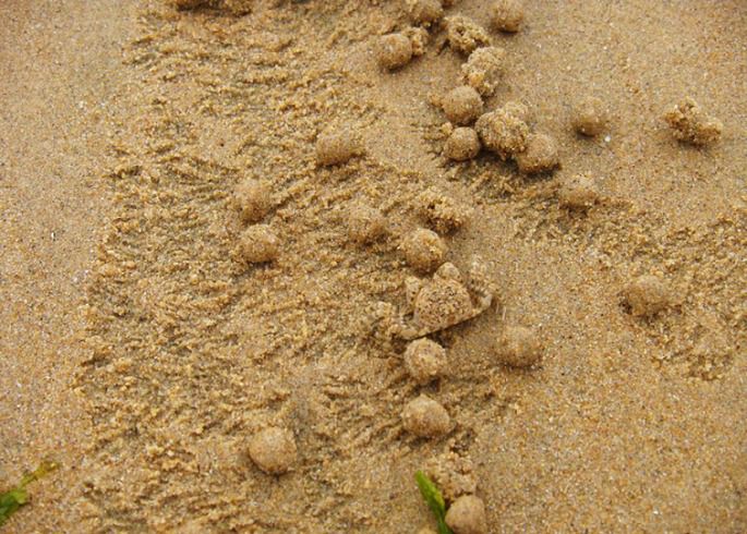 原来是小螃蟹的家,螃蟹的伪装术很好,颜色和沙滩很像,你看见它了吗?