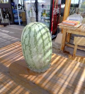 说说硒砂瓜吧(附图),硒砂瓜是宁夏当地特产,餐馆的每张桌子上都竖着一个大大的瓜,不仅好吃,而且能长期保存,朋友大刘说这瓜不用放冰箱的,就放室内,冬天吃吃,一样新鲜,原因就是皮太厚了。按理来说沙漠地区贫瘠干旱,难长水果,但是很神奇,竟然能长出硒砂瓜这种美味多汁的宝贝。