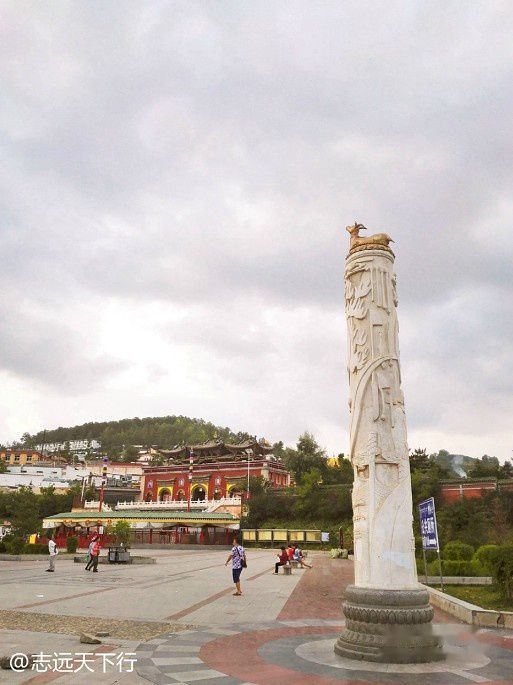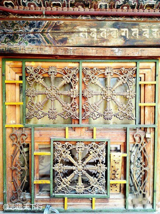 图:塔尔寺大门前的立柱,上塑佛教圣物:法轮、山羊神兽。