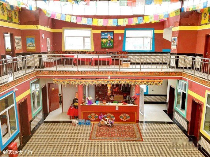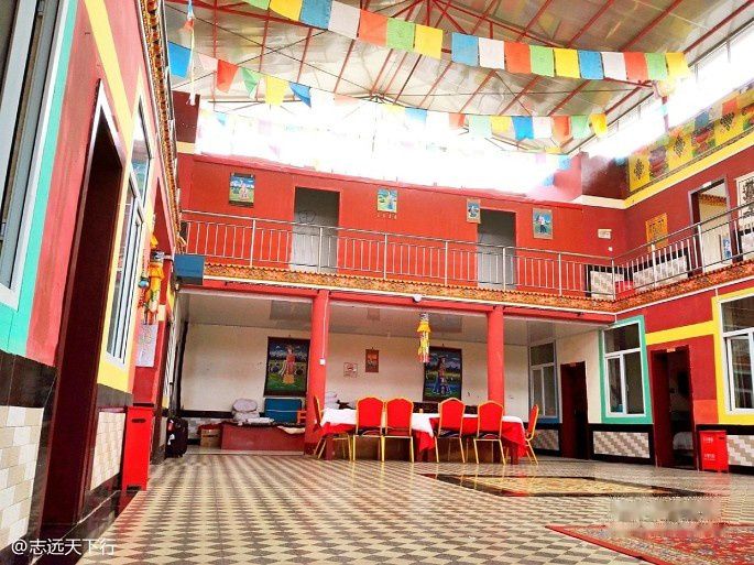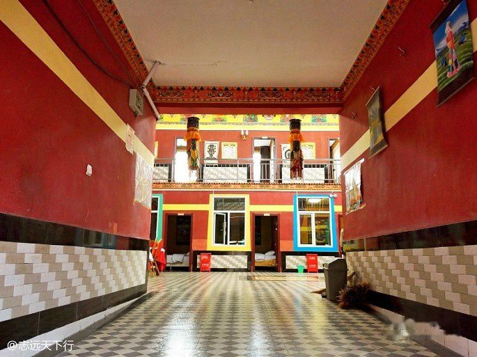 把车停好,卸下行李,进入客栈大门,藏红色的外墙非常抢眼。这是一幢非常具有藏式风格的民居建筑,有门楼,在庭院,有中庭。客栈里共有上下两层,二十几个房间,中庭为全封闭,客人多的时候,也可以临时住人。