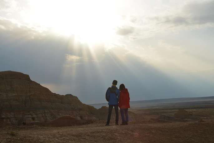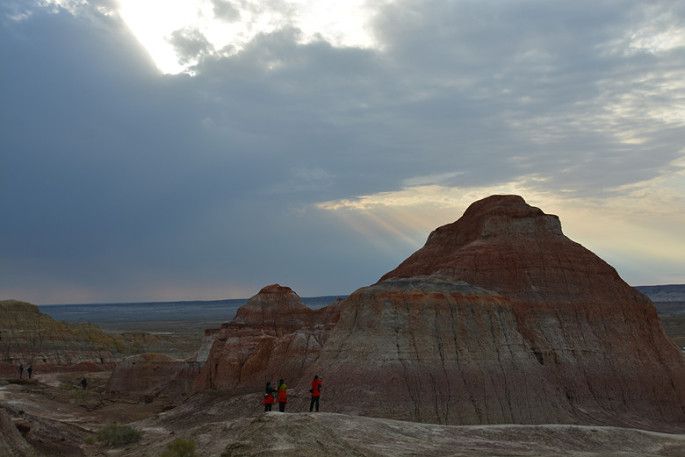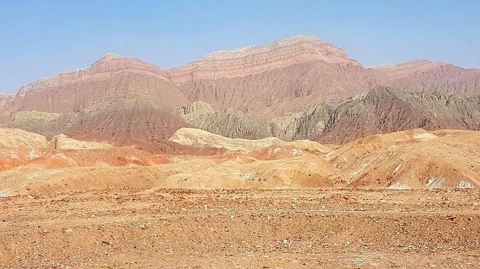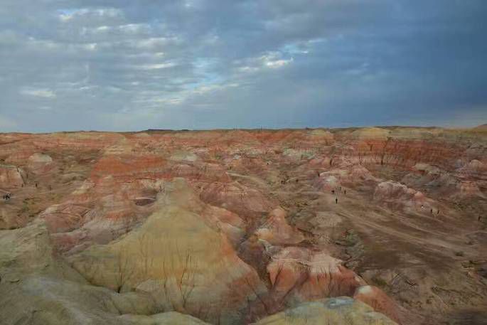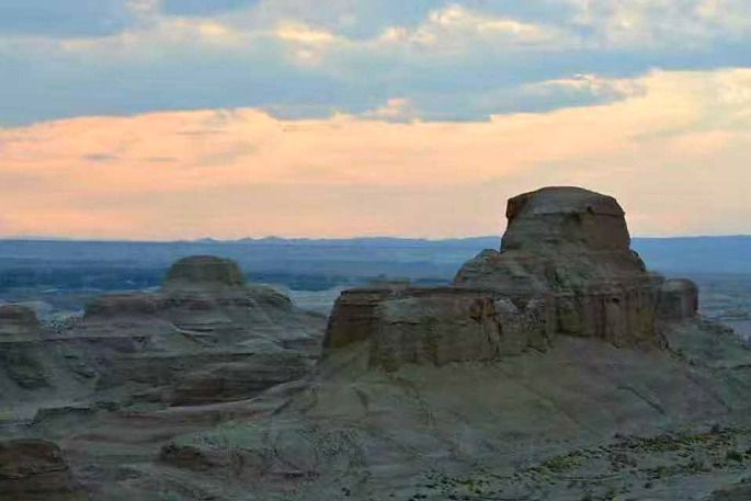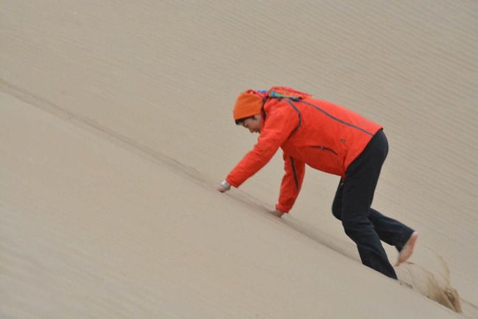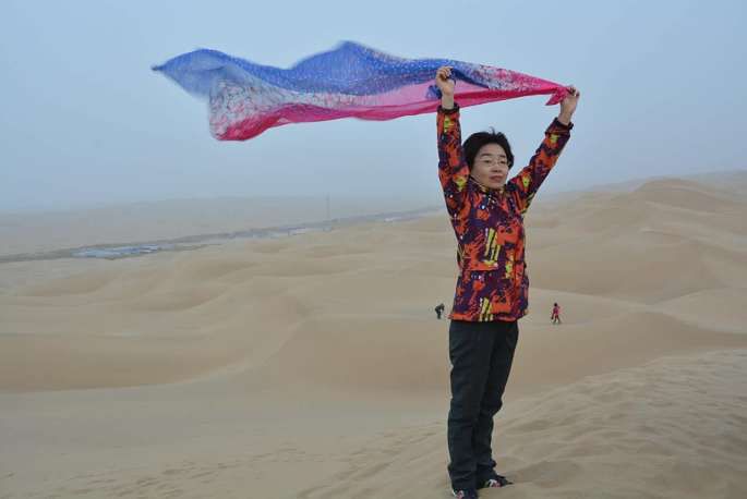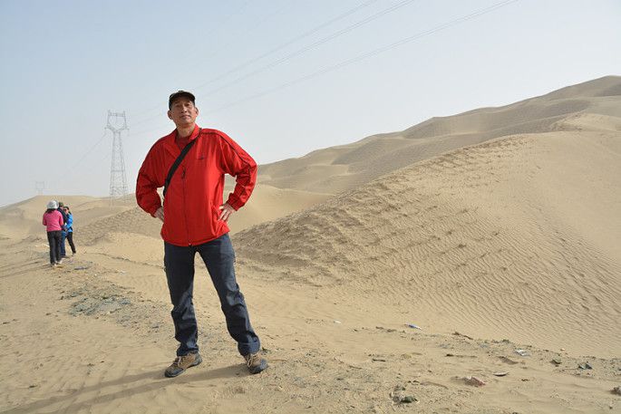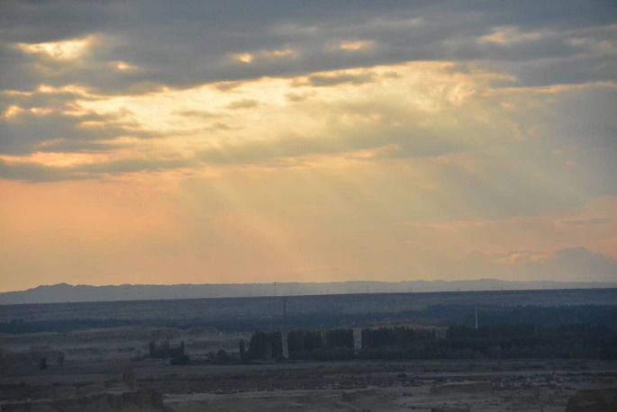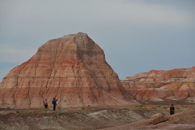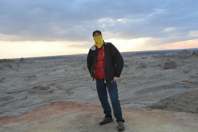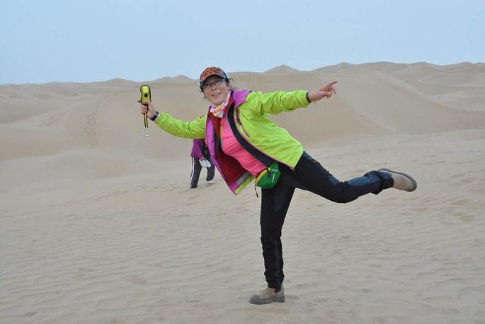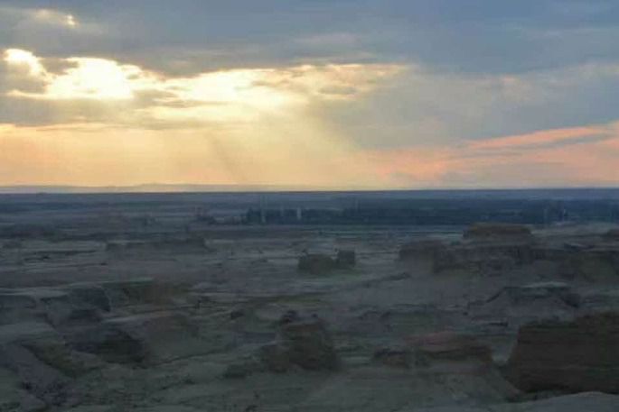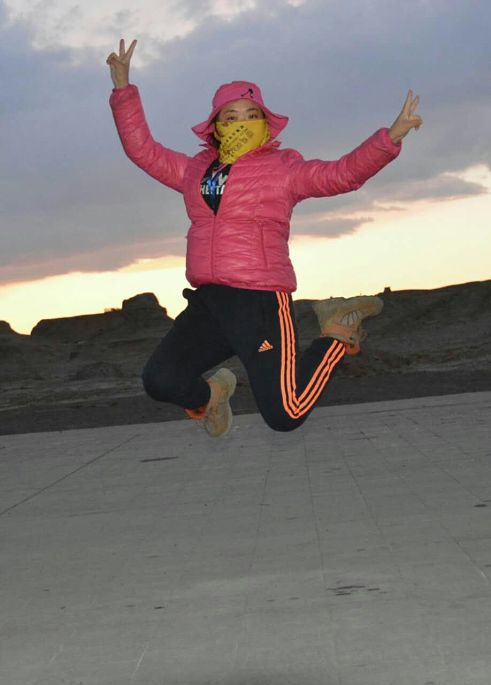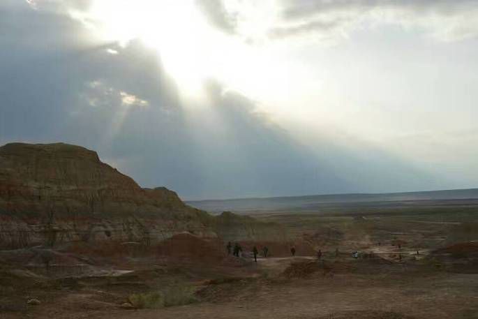 离开乌鲁木齐,来到荒野戈壁滩,气温明显下降,赶紧穿上衣服。