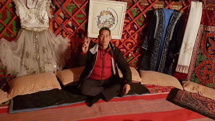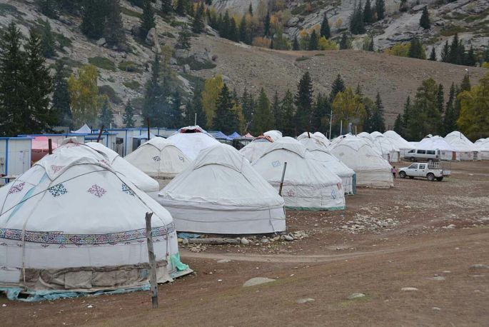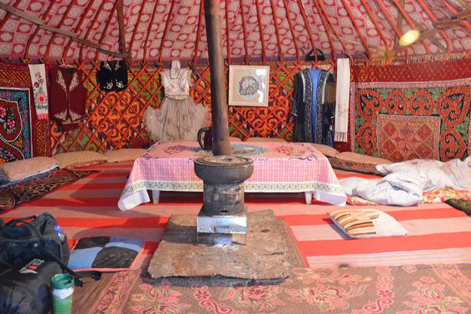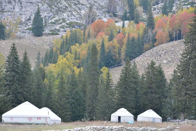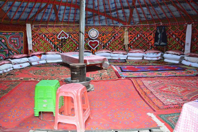 晚宿额尔齐斯河大峡谷石门接待站(哈萨克毡房)类似蒙古包的样子,领队不说明,我们还真的分不清呢?里面生有炉子,晚上外面温度接近零度,但里面很暖和。晚餐吃团餐烤全羊,饭后还围着炉子唱歌跳舞,充分展示青年人的活力。