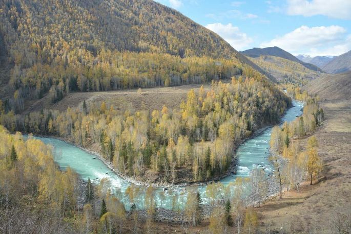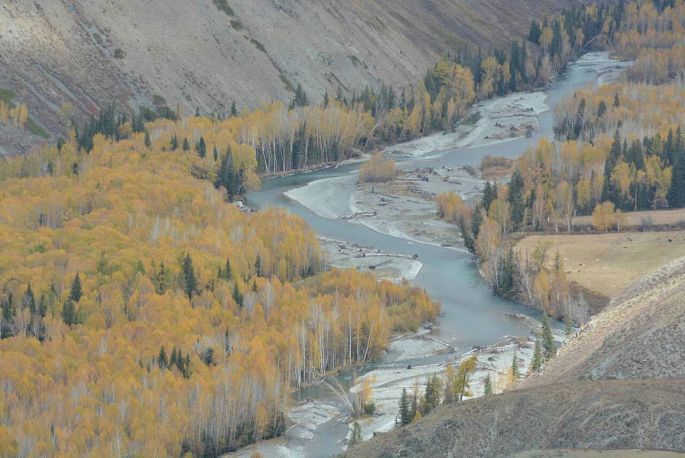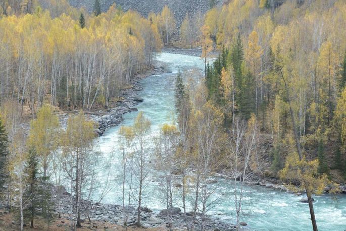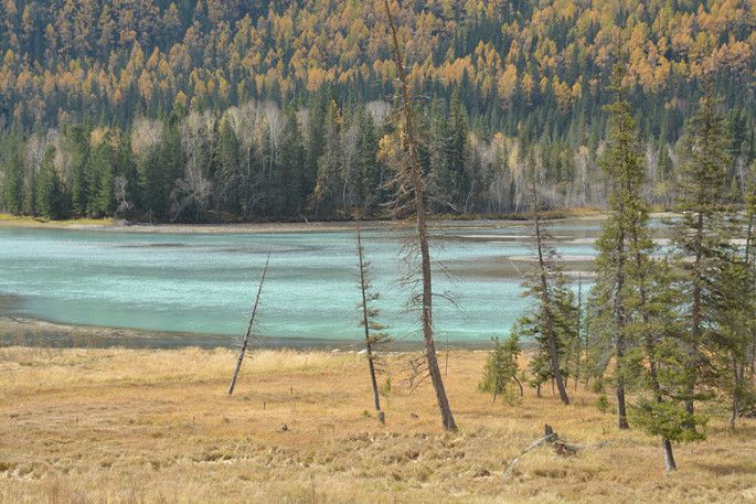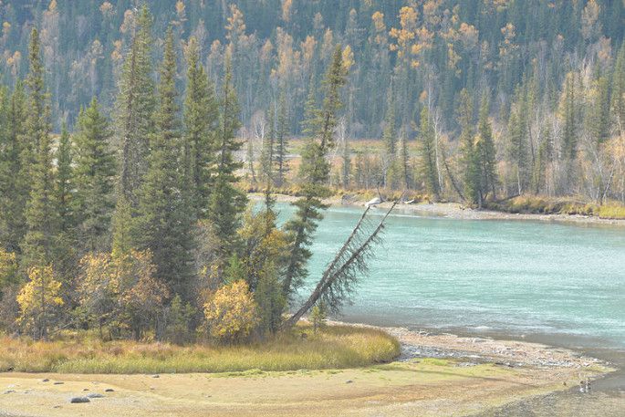 沿216国道一路向北,进入阿尔泰山脉,也就是北疆地区了,经过美丽的可可苏里——鸭泽湖和伊雷木湖,这里属于北疆地区,纬度高,但却在湖边生长了大片芦苇,马儿在湖边悠閒,好一派北国江南感觉,队员们都在拍照,还拍了这次行程的第一张集体照(全家福),最后到达中国的宝石之乡—富蕴县可可托海镇,这里是额尔齐斯河的发源地,一条流向北冰洋的河流。我们沿额尔齐斯河抵达可可托海门票处,换乘景区区间车行驶22公里进入额尔齐斯河大峡谷:额尔齐斯河,白桦林,神钟山,神像峰,牛羊,哈萨克牧民都是我们观赏,拍照的最好题材。