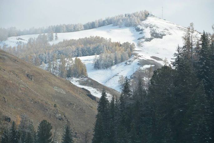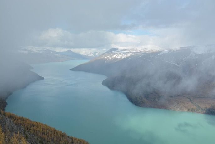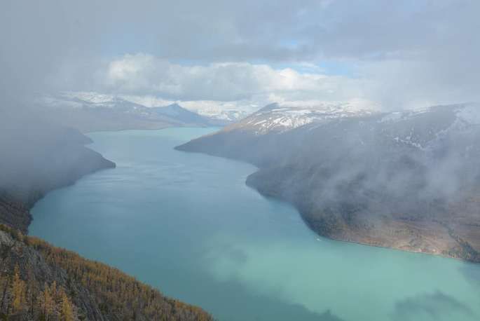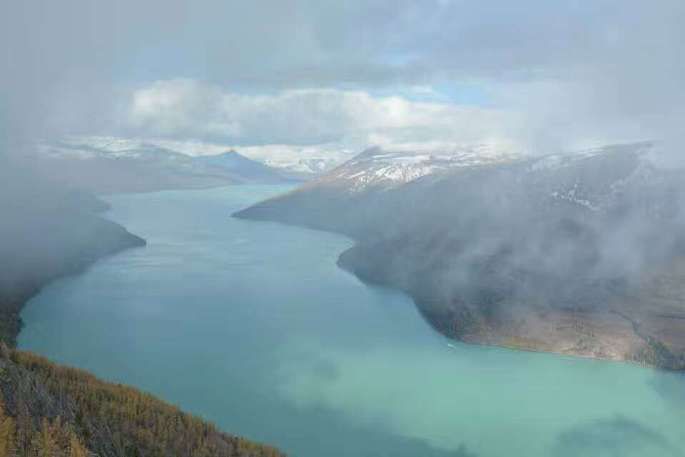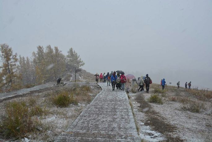 早7点多起床,步行前往白哈巴观景台,拍摄晨曦中的白哈巴,木屋,草垛,木栅栏,袅袅炊烟,金黄的白桦林,远处的雪山,一幅秋冬的油画,10点乘区间车前往喀纳斯湖,昨天还在担心白哈巴到喀纳斯的区间车通不通的问题,到十点钟已经得到了肯定,景区用大巴车送游客到喀纳斯,一个多小时后到了喀纳斯,找到住地,放下行李就赶往景点。先坐区间车到神仙湾,再从神仙湾沿栈道走到月亮湾,最后走到卧龙湾,全程大概几公里,一个多小时,这是最常规的旅行社路线,景色不错,但比后一天我们徒步道禾木的风景逊色不少,哪个绝对是原生态的,原汁原味的自然风光。中午随便在山上吃了泡面,马上坐车去观鱼台,景区换乘中心到观鱼台来回区间车费120元,有点小贵,但观鱼台是喀纳斯能够看到喀纳斯湖全景的一个最好地方,下了车开始登山,1068级台阶,半小时到了最高点,喀纳斯湖一览无遗,以美丽多姿展现在我们面前,蓝色湖水,阿尔泰山的雪,满眼金黄的白桦,蓝天白云,可以比美西藏羊湖。下山时突然下了鹅毛大雪,秋色马上换了冬景,这也是个意想不到的收获,南方人嘛,总想看看雪,虽然比这更大的雪在东北,在漠河经历过。