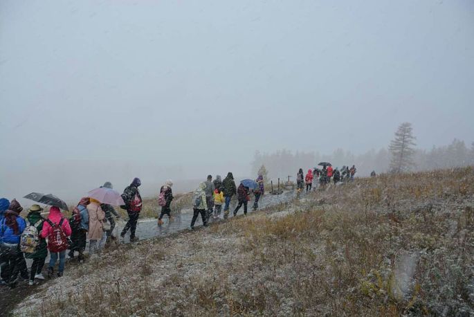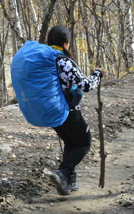 早上坐区间车到贾登峪,到了徒步起点,徒步开始,尽管已经把背包精简,但吃的喝的还有衣服,单反相机,也有十多斤重,28人的队伍,一开始是一起走的,比较整齐,走了几公里后,队伍就分成了三部分,拉开了几百米距离,专门派人押后作收容队,最后十公里,有五个队员实在走不动了,只能坐摩托车到禾木,其余24人包括领队小太阳都在晚上八点多顺利到达禾木,用时九小时完成了从喀纳斯到禾木的28公里徒步,实际有可能超30公里。