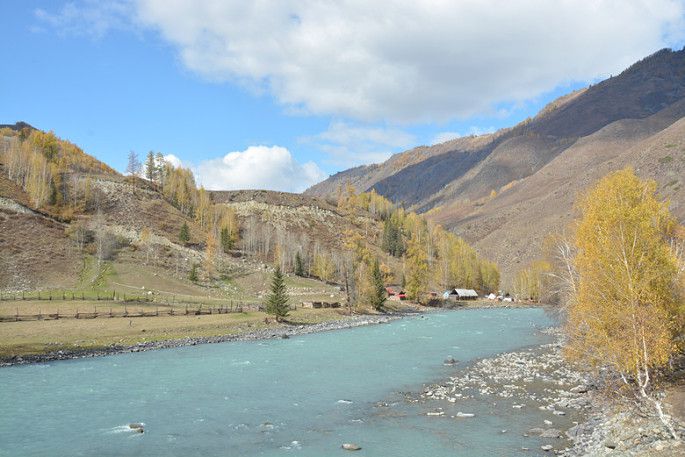 早餐后,一路向西,经布尔津河,托洪台水库、前往哈巴河县,在哈巴河县边防大队统一办理边防证(持有外国护照及台湾通行证的队员不能进入白哈巴村,可以和我们旅行车师傅前往喀纳斯湖,在喀纳斯湖游玩等待大部队),我们队伍有五个人来自美国,新加坡,马来西亚以及台湾,他们自然进不了白哈巴了,只能跟兵哥哥的车直接去喀纳斯。办理完边防证走边境公路前往白哈巴村,一路阿尔泰山脉边境秋色,更有冬景,由于降温,喀纳斯下雪了,白哈巴也下雪了,白哈巴到喀纳斯的区间车也不通了,我们还真的有点担心呢!在白哈巴铁列克提门票站换乘区间车,抵白哈巴自由活动:远观边境风光,远眺萨尔哈穆山、五乳峰、俯视中哈界河哈巴河,白哈巴村以图瓦人为主,位于阿尔泰山山脉的山谷平地上,与哈萨克斯坦的大山遥遥相望,这里还是中国与哈萨克斯坦边境,有着守卫祖国的边防林,还有着神圣不可侵犯的界碑!但是界碑自八月份起已经不允許游客去了,但我们队中还有有人冒险骑马去了,好像是阿文的吧,一个资深的女驴。村子坐落在一条沟谷之中,村民住着朴素的尖顶木头房子,这些木头房子星罗棋布地分布在沟谷底,金黄色的桦树、杨树点缀其间,两条清澈的小河蜿蜒环村流过。山村的西北遥对中国与哈萨克斯坦国界河,南面是高山密林。秋季一到,山村是五彩的红、黄、绿、褐色,层林尽染,犹如一块调色板,加之映衬阿勒泰山的皑皑雪峰,夕阳、牧归、田园、雪山、边境、界河、图瓦人村落、原始人家,一年四季都是一幅幅完美的油画,晚上白哈巴村口平台欣赏美丽的日落!