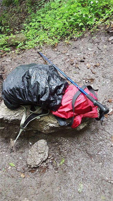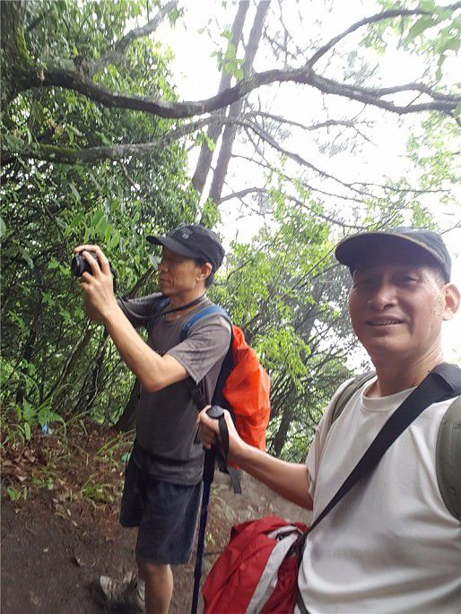 早上天还下着毛毛雨,走过一段路后,雨势增大,要穿起雨衣,路陡负重不好走,加上第一个小时段未能适应,感觉非常吃力,有点狼狈,后来干脆换了短裤短衫,慢慢调节适应,在中午12:30到达目的地发云界,用时四个半小时,这个速度一般般,跟登华山上到北峰时间差不多。