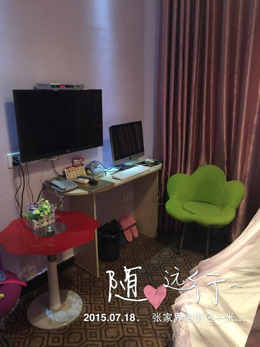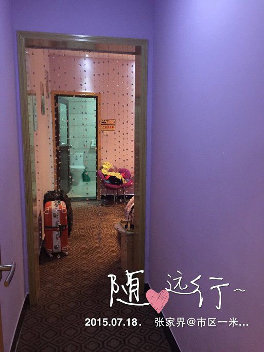 导游帮我们取了行李,然后回到张家界市区,因为明天要去猛洞河漂流,从市区走比较方便。这是我们入住的一米阳光客栈,我们的这间叫“紫色梦”。