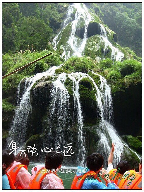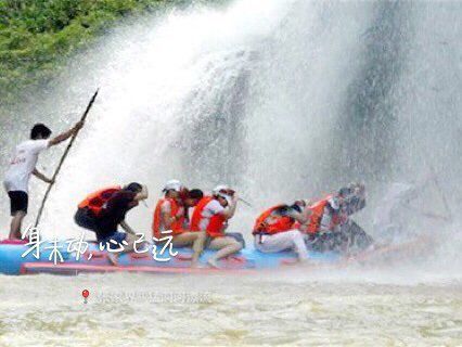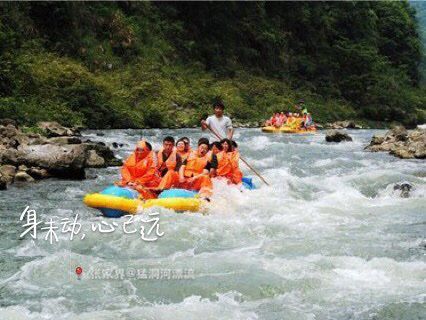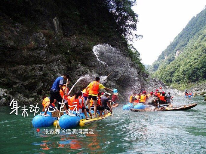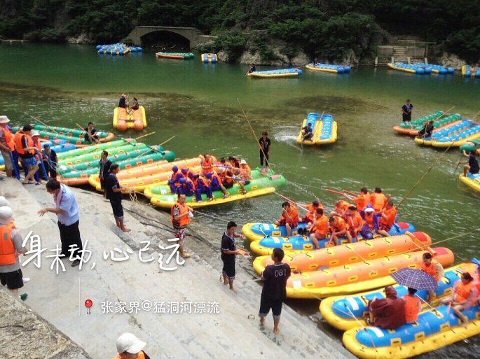 我们起了个大早,包车直奔猛洞河漂流,大家都很期待。车开了三个多小时,到达了目的地。我们每人都穿了两套非一次性的雨衣,一件分体,一件连身,脚上套了 鞋套,自以为防护措施很到位,旁边游客投来异样的眼神,我就全当是羡慕吧。。。但残酷的事实证明,即使再加两套雨衣,也是一样会从头到脚,从里到外全部湿 透。。。