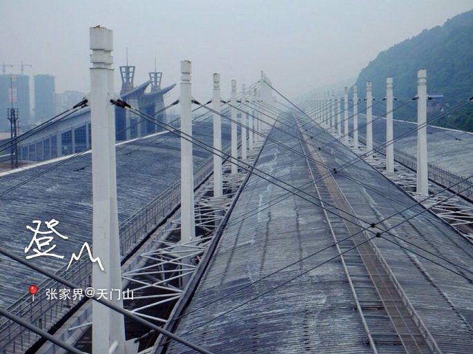 索道越过张家界火车站上空,突然发现薄雾中的火车站好美。。。