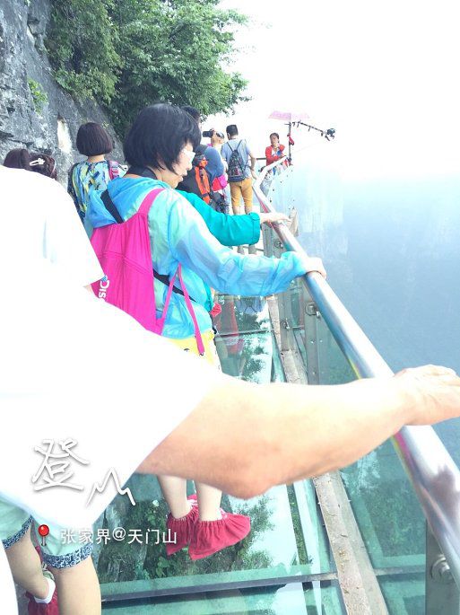 玻璃栈道入口,要买鞋套的,五元一双,说是防止划花玻璃,自己带的不顶用哟:)这里还设计了两块玻璃地板,估计是让游人先试胆儿的,呵呵。