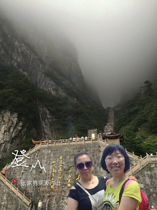 到达景区观光车站有两条路,一是走下999级台阶,二是再做一段收费的电动扶梯。我们的选择。。。当然是后者!下来后,正好仰望天门洞和那999级台阶,如果没有那么大的雾气,该是何等壮观,天门洞开,世界奇观。。。此地合影留念吧!