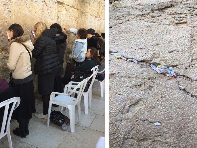 我轻轻步入右边的祈祷区内,慢慢走近石头墙,教徒们的虔诚之态令我肃然起敬。只见她们面壁肃立于哭墙前祈祷,或低声背诵经文,缅怀犹太民族辉煌的历史;或以手抚摸墙面,如同抚摸犹太人民千年的伤口;或将写着祈祷的纸条塞进墙缝里,将自己的心愿传递给上帝;或端坐在椅子上一整天,面对哭墙沉浸在与上帝的对话中。