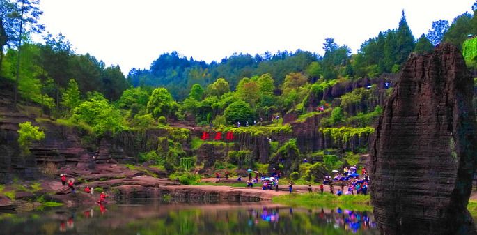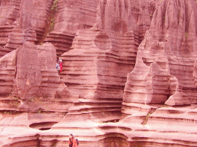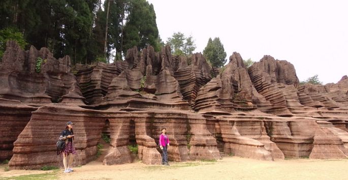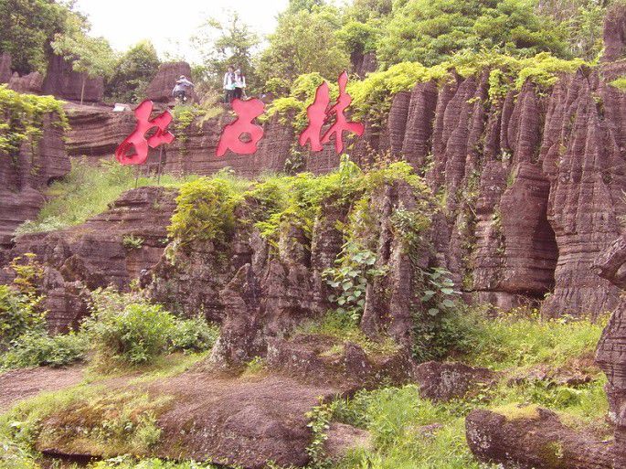 《红石林》一个热烈浪漫的地方。是中国唯一红色碳酸盐岩石林。你知道碳酸盐易吸潮的,如果你不是在天高气爽的日子来看她,她就披着褐红轻纱。如果艳阳高照 岩石水份蒸发,那她就着宣红的婚袍。(越干燥,岩石颜色越鲜红)那就是她最美丽,最热烈火辣,最浪漫奔放的时光。约女神也要选对日子喔!