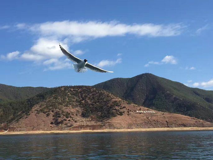 第一站:洛圭码头坐木船游湖(目的地王妃岛,来回1.5小时左右,70元/人),遇到阳光明媚的大好晴天,在湛蓝的湖光下,木船穿过一丛丛芦苇,在水中清淅可见的水草植物中缓慢前行,水草随着水波摇摆荡漾,不时能见到一群群海鸥从水中飞起,飞向自由的蓝天中。王妃岛其实比较小,是因为这里居住着曾经的末代王妃肖淑明,为了‘和亲’政策,从成都不远千里来到这里,很难想象当时的王妃是种什么心情,多年以后这里又是否变成了故乡?站在岛上是否还会遥想远方的亲人?