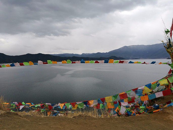 第四站:泸源崖。这里是泸沽湖地下水出水口,石崖如刀削一般,崖顶挂满经幡,从这里可以俯瞰湖面,白云、山峰、湖水、经幡……美景尽收眼底。