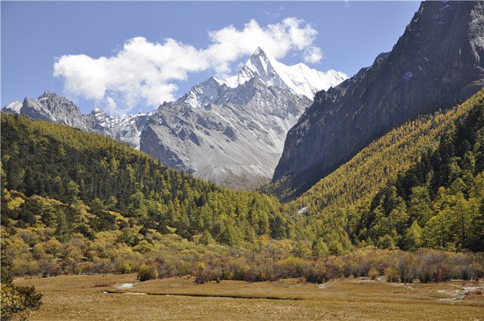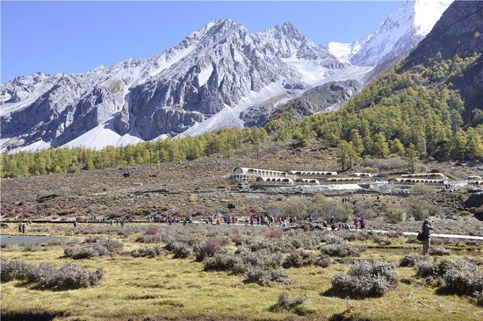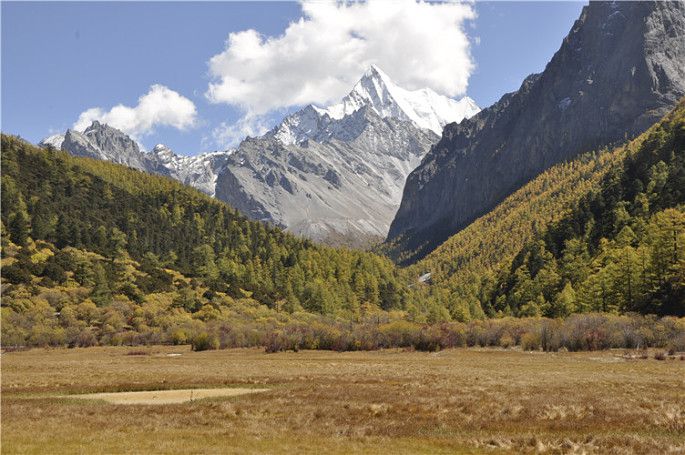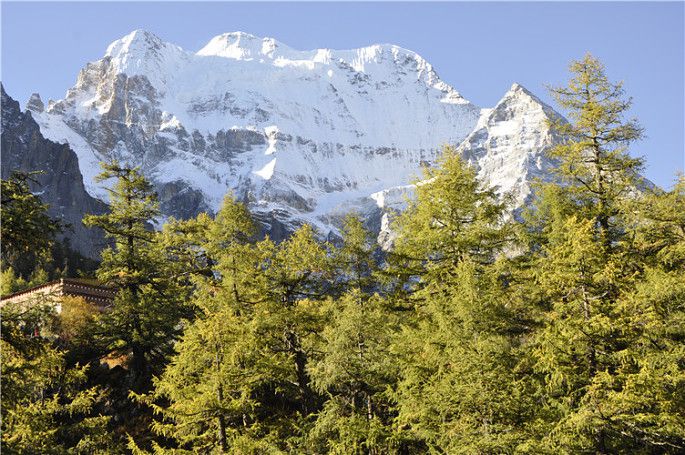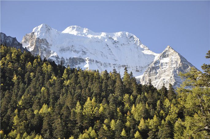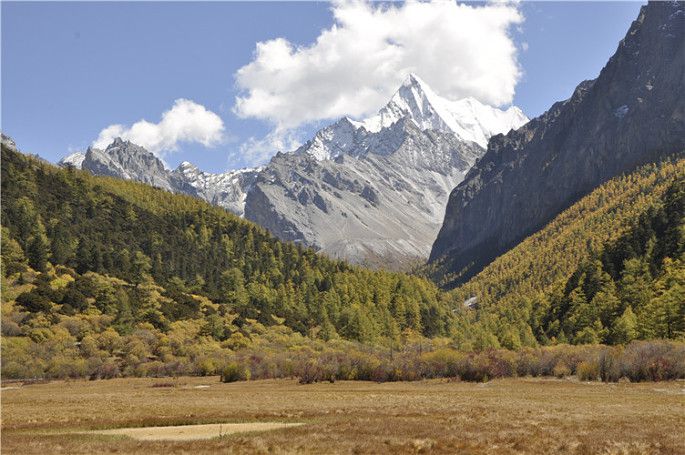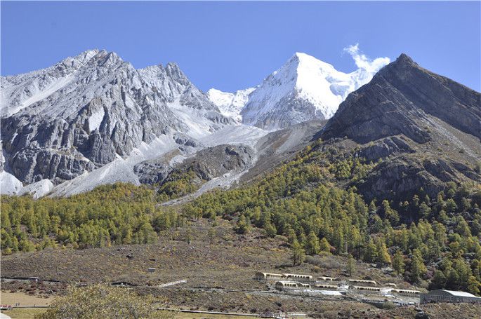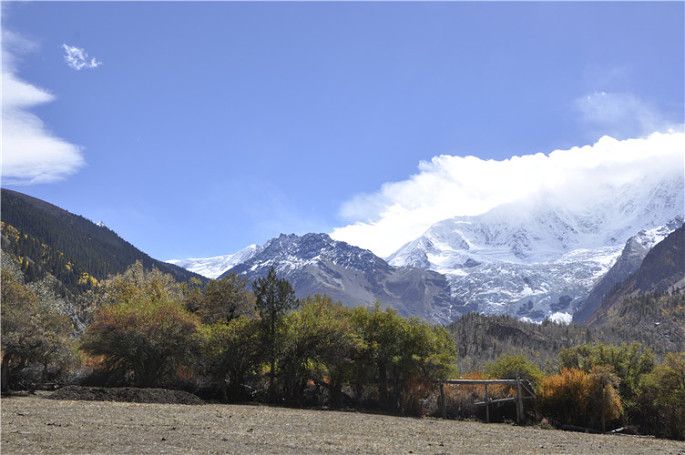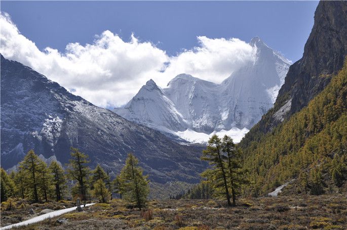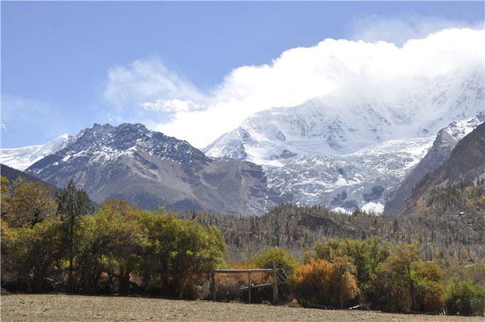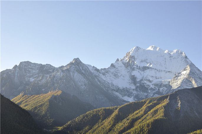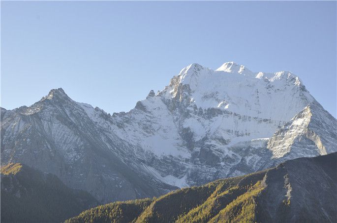 山上海拔4000多米地方,近距离看雪山。稻城三神山就在眼前,最先看到的是仙乃日、随后是央迈勇和夏洛多吉。