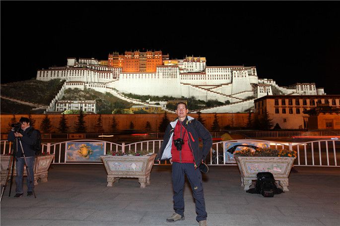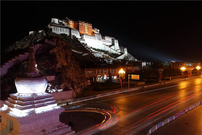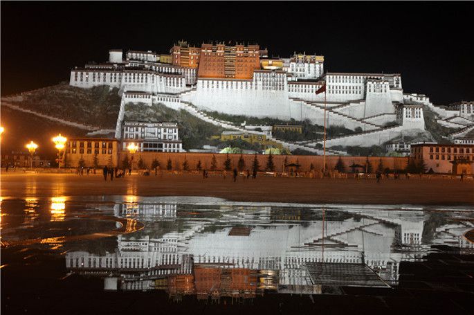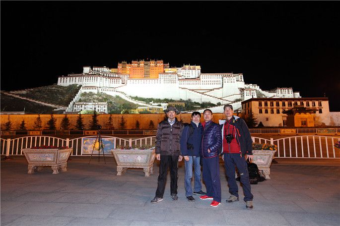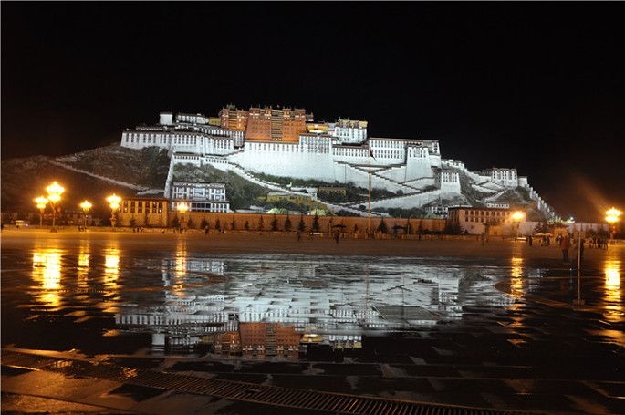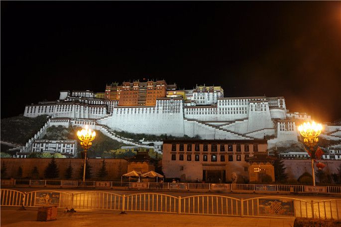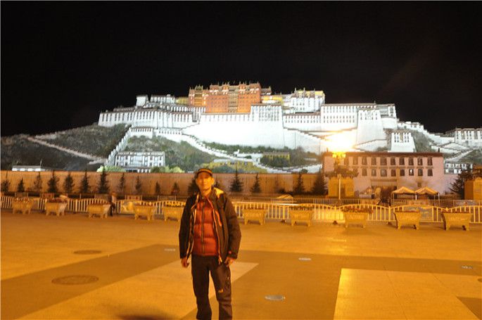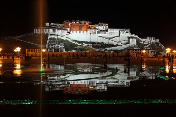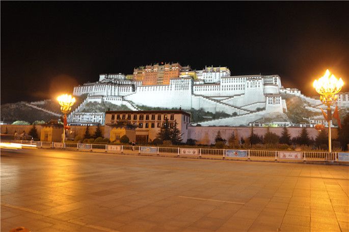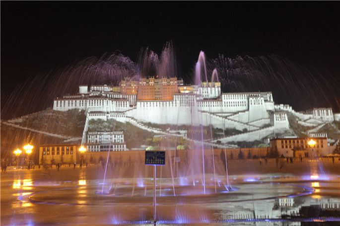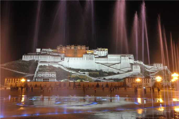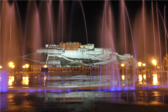 晚上在布达拉宫广场看夜景,与白天不同,晚上广场开了音乐喷泉,8点到9点,五彩缤纷的喷泉把布达拉宫衬托的更加美丽。