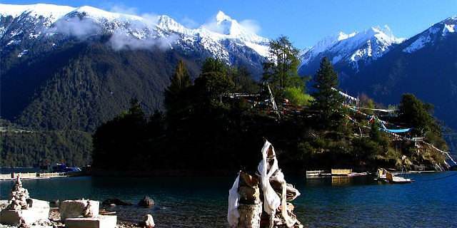 巴松措又名措高湖,藏语中是“绿色的水”的意思,湖面海拔3700多米,面积达6千多亩,位于距林芝地区工布江达县50多千米的巴河上游的高峡深谷里,是红教的一处著名神湖和圣地;然乌湖,西南有岗日嘎布雪山、南有阿扎贡拉冰川、东北方向有伯舒拉岭,是著名的帕隆藏布江的主要源头,四周雪山的冰雪融水构成了其主要的补给水源;南迦巴瓦峰,是中国西藏林芝地区最高的山,海拔7782米,为西藏最古老的佛教“雍仲本教”的圣地,有“西藏众山之父”之称;米堆冰川是西藏最重要的海洋性冰川,也是世界上海拔最低的冰川冰川主峰海拔6800米,雪线海拔4600米,常年雪光闪耀、冰洁如玉。