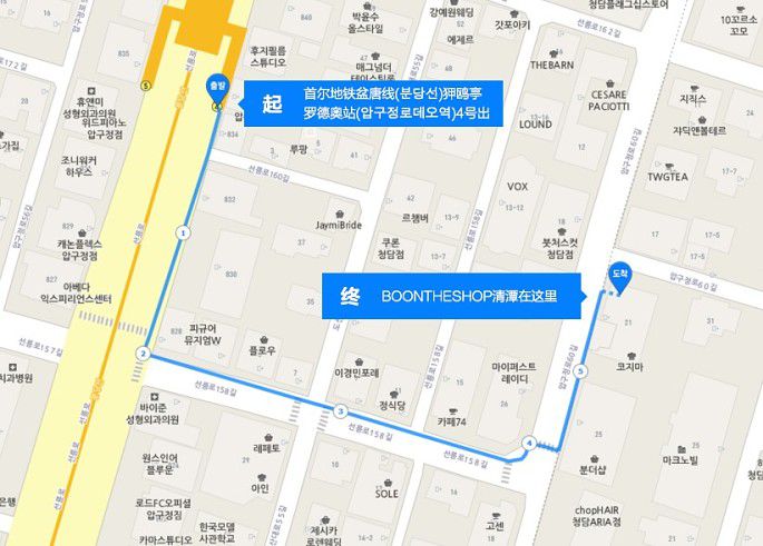 4. 交通:首尔地铁盆唐线狎鸥亭罗德奥站4号出口附近,步行约10分钟。(转弯后有个小坡,直走上去就是了,如下图)
