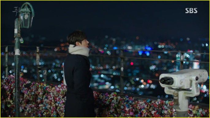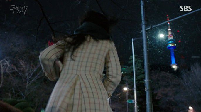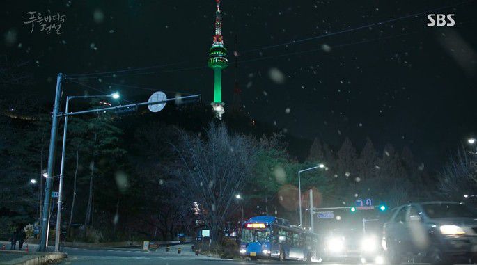 南山塔最近一次在韩剧中出镜貌似也是在《蓝色大海的传说》里,追剧的亲们秒懂……对滴!正是剧中沈清(全智贤)站在许俊宰(李敏镐)家的阳台上指着不远处的南山塔,和李敏镐约好初雪时见面的地点!(虽然那一集里两人并没有在南山塔上搞浪漫,全女神还被他哥给撞了……忍了,剧情需要嘛)