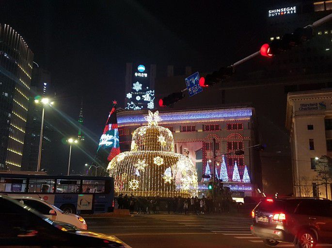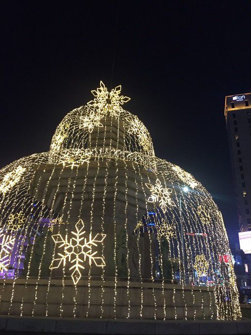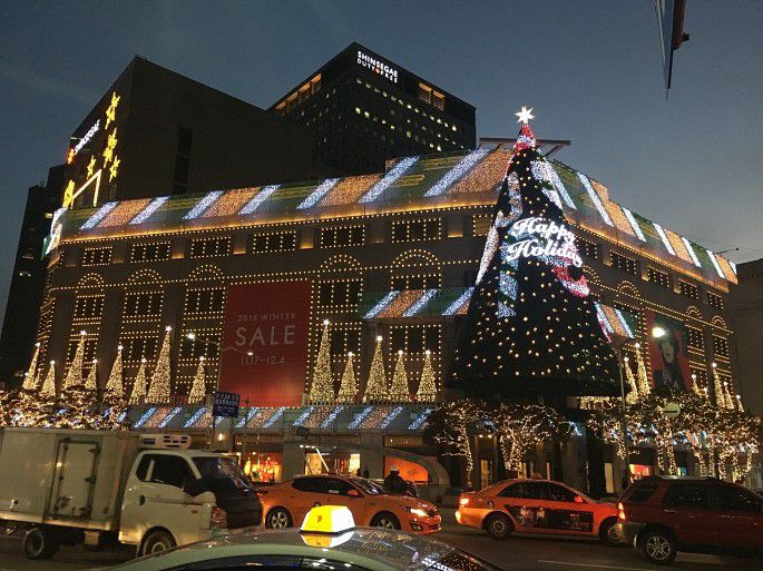 从N首尔塔下来坐地铁回去的路上,看到了新世界百货明洞总店绚烂的灯光照明!虽然天很冷,但还是跟小伙伴站在那里拍了很久 >_<
