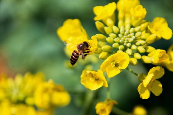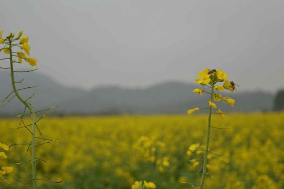 这里较为安静,少有人打扰,唯有山间的油菜花海,还有花中穿梭采蜜的蜜蜂,油菜花金浪翻滚,蜜蜂花间采蜜忙。
