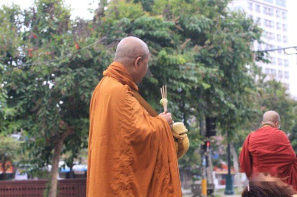 他们端着自己的钵来到跪在地上的信众前,接过食物和钱等物品,然后为信众念一段经文,再继续向前。